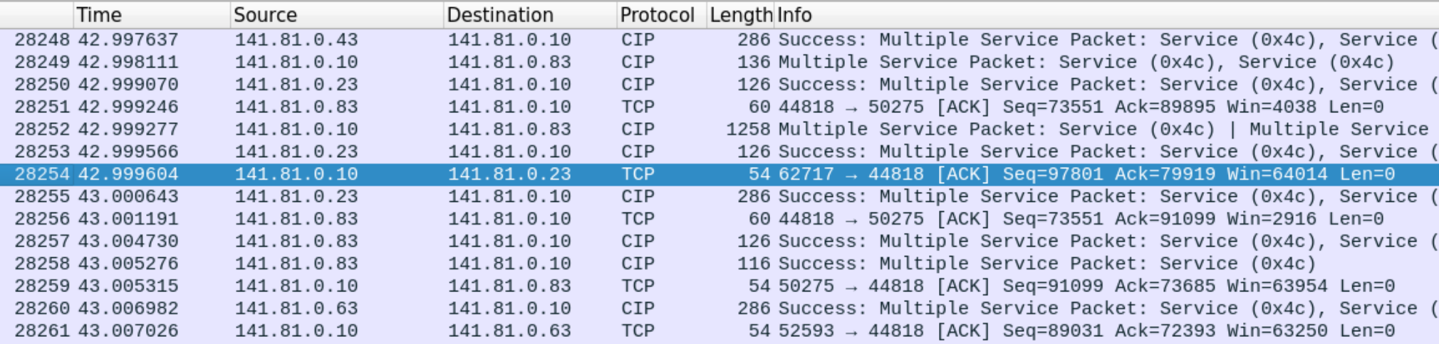 As we can see, this is indeed not a Modbus spike but instead appears to be caused by 148.81.0.10 sending CIP (Common Industrial Protocol) Multiple Service Packets to a range of other hosts that are then responding with Success messages.